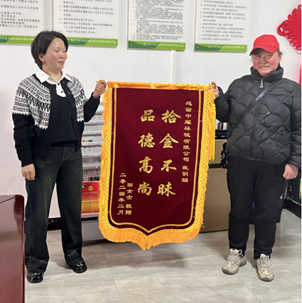 2024年4月9日上午,一位陌生女士帶著錦旗和禮物來到茶園路辦公室,進門就找戴明娟。原來在2月24日,我司環(huán)衛(wèi)工人戴明娟在鳳嶺街道城北加油站附近撿到一個挎包,尋找失主無果后又擔心耽擱太久失主著急,便拿著包去到鳳嶺街道派出所求助,當天晚上由民警聯(lián)系上失主田女士將包物歸原主。